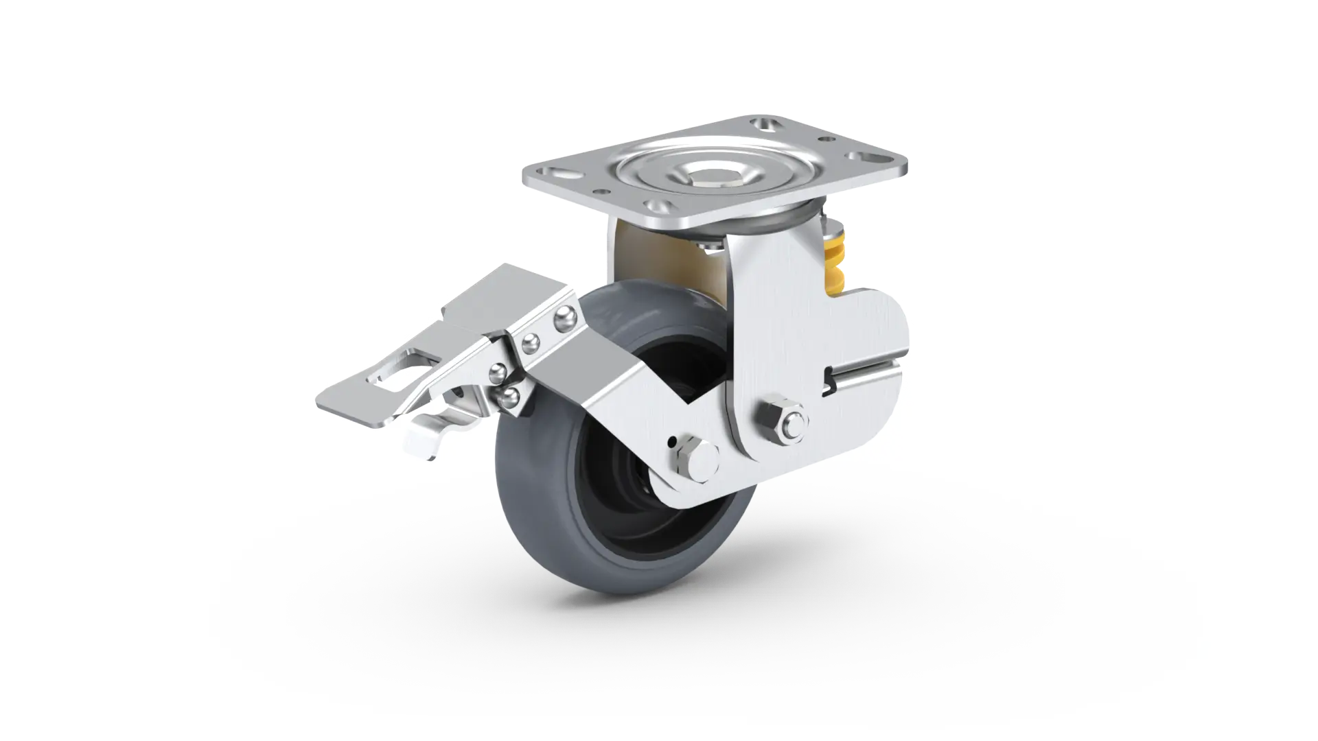 Odpružené otočné rolovacie koliesko s montážnou doskou na štyri otvory